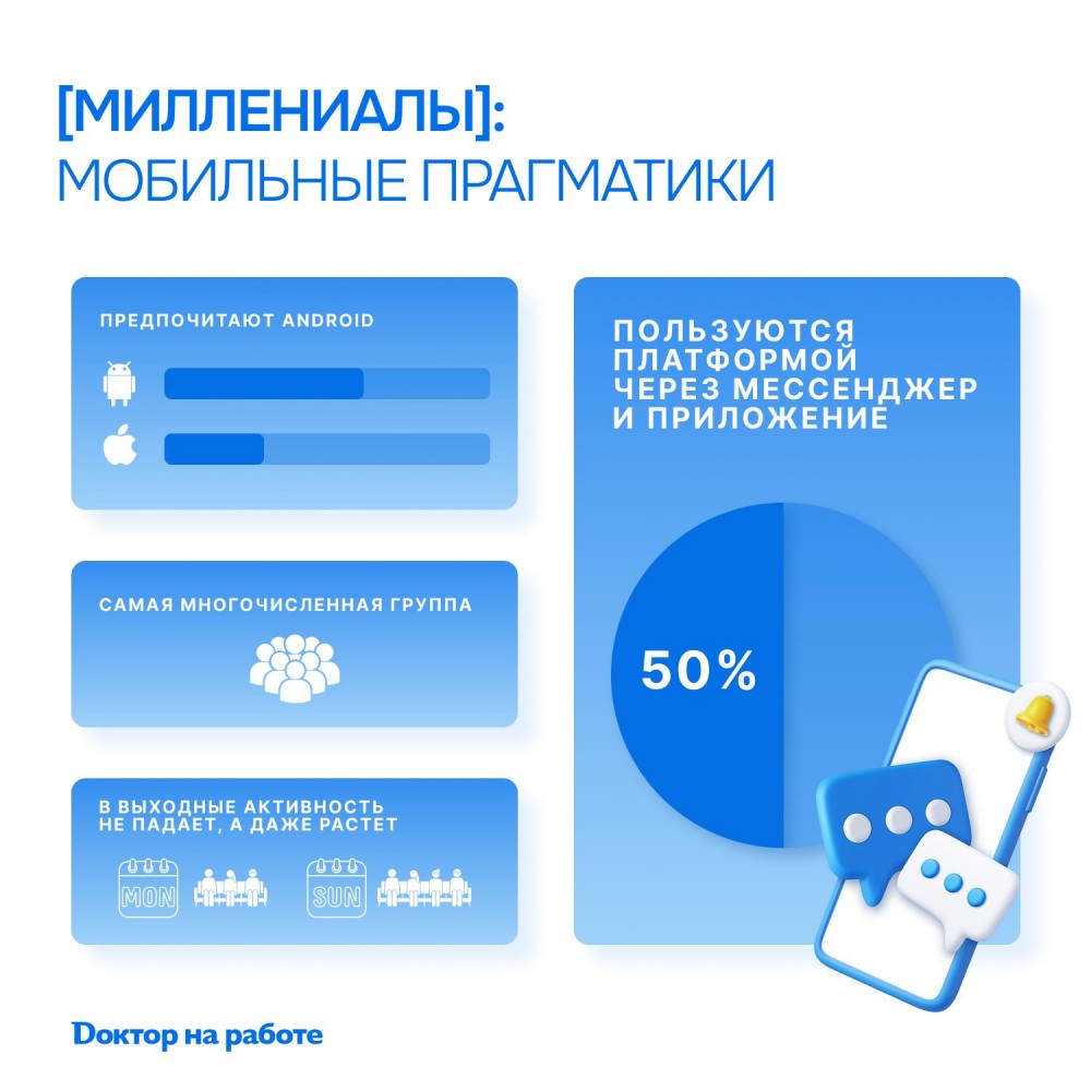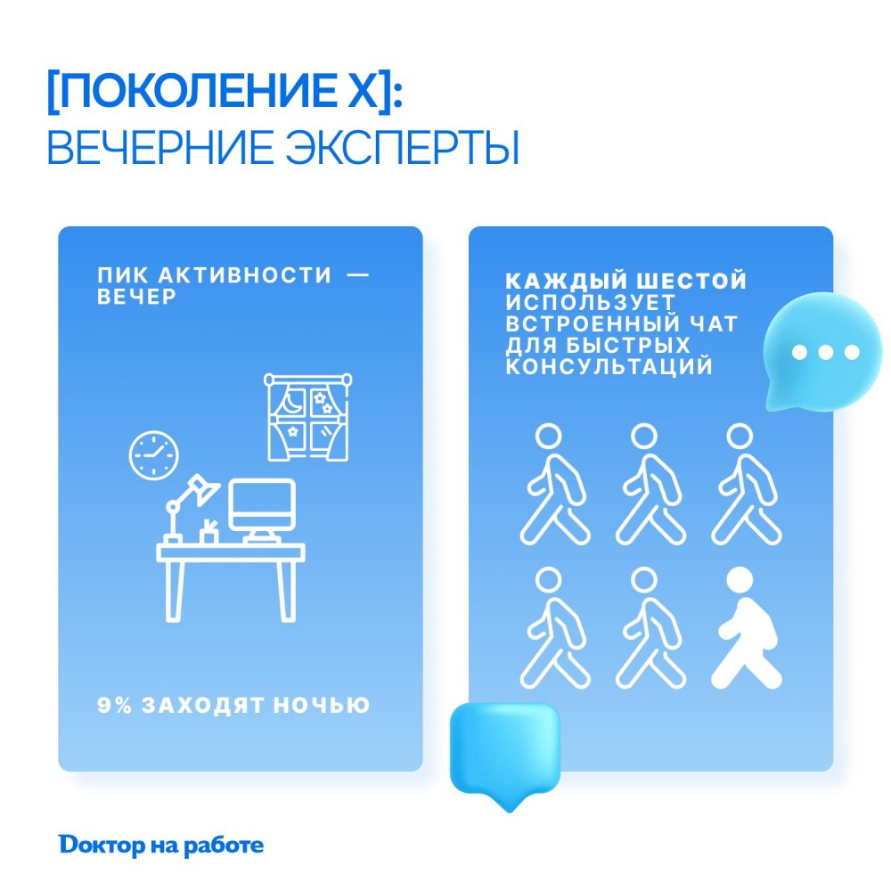 У них есть любимые дни — вторник и пятница, когда нагрузка в ЛПУ чуть меньше. Поколение X пишет ёмко и по делу: средняя публикация — около 2000 символов, без лишней воды. Каждый 6-й врач использует встроенный чат для быстрых консультаций с коллегами.