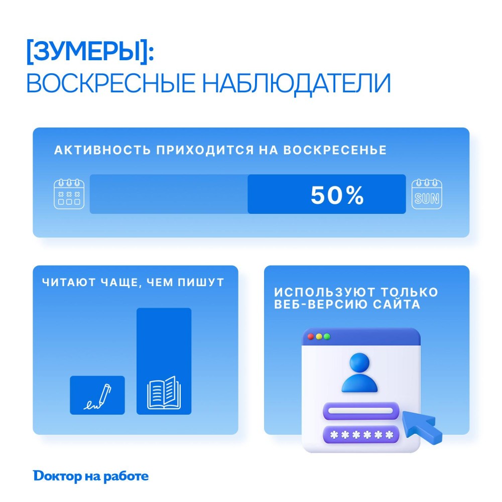 Зумеры — единственное поколение, которое массово заходит на платформу по воскресеньям: половина их активности приходится на этот день. Видимо, готовятся к новой рабочей неделе. Они используют только веб-версию сайта и практически не скачивают мобильные приложения — парадокс для поколения, выросшего со смартфоном в руках.