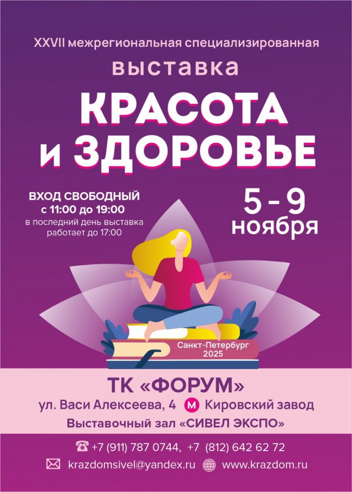С 5 по 9 ноября в Санкт-Петербурге пройдет межрегиональная специализированная выставка «КРАСОТА И ЗДОРОВЬЕ». Место проведения – метро «Кировский завод», Торгово-выставочный комплекс «ФОРУМ», ул. Васи Алексеева, 4, Выставочный зал «СИВЕЛ ЭКСПО».